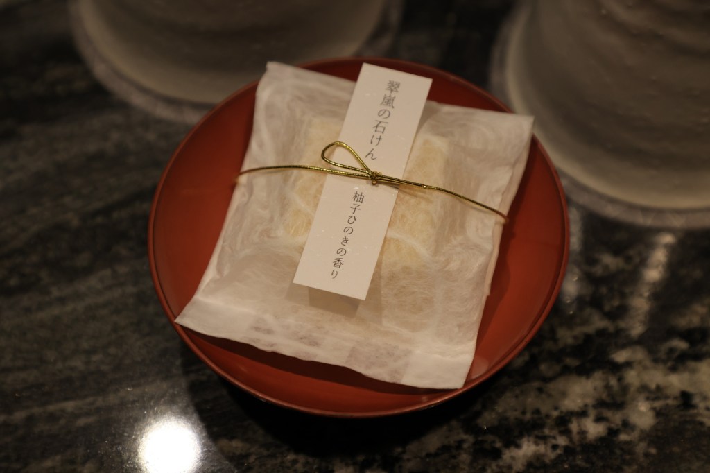 翠嵐特注のオーガニック石鹸は、使ってみるとやはりヒノキの香りがしてきて、こだわりの逸品であることが分かりました。こちら、購入が可能で、4個入りで2,970円という高級品です。