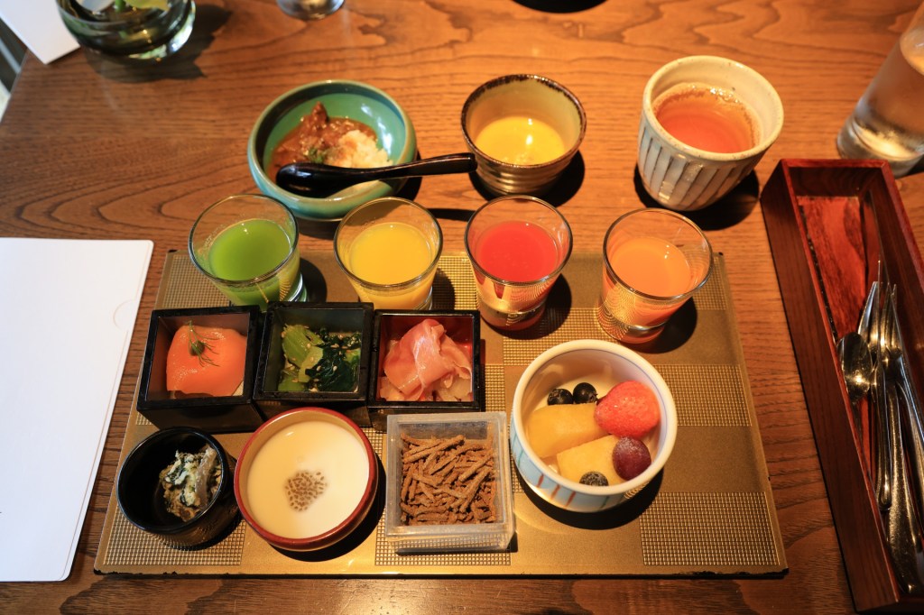 プレート上段に並んでいるのが翠嵐名物の4種類のドリンクで、左から、グリーンスムージー、オレンジジュース、トマトジュース、キャロットジュースです。彩り豊かでシャキッと目が覚めます。